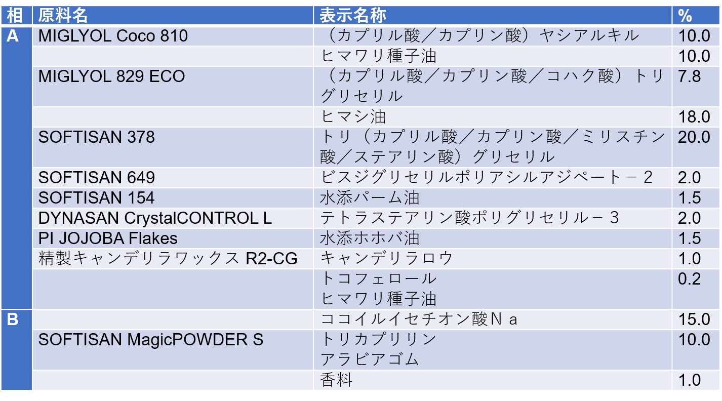 SOFTISAN154とPI JOJOBA Flakesを使用して、手で簡単に掬えてなめらかな使用感になるように硬度を調整しました。