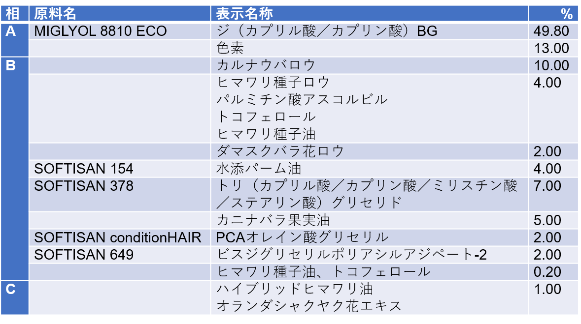 MIGLYOL 8810 ECOは顔料の濡れ性を向上させ、軽やかで均一な仕上がりに寄与します。