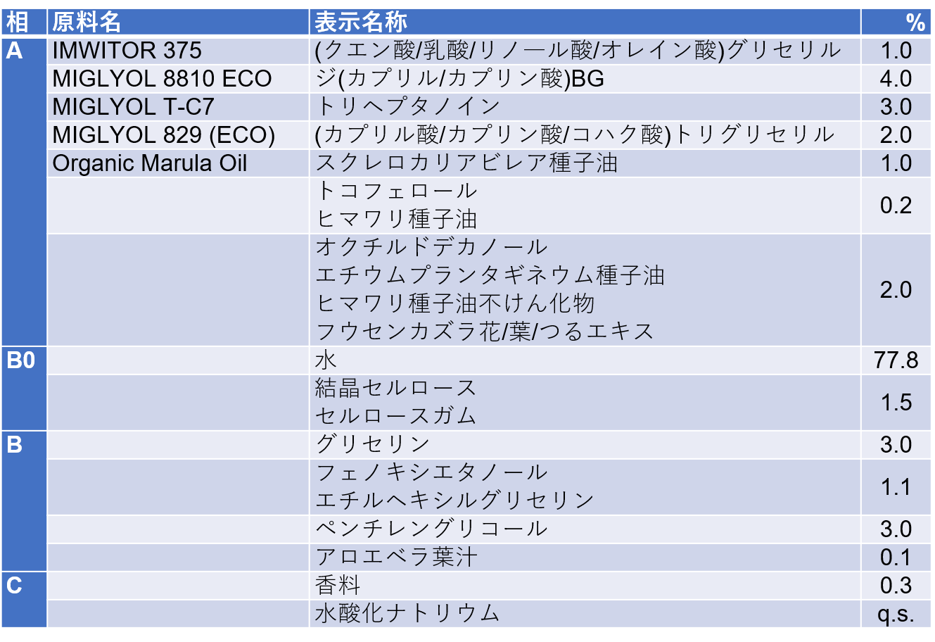 MIGLYOL 8810 ECO が水のようにさらっとした感触を、なめらかなのびの MIGLYOL T-C7 と、ラグジュアリーなタッチの MIGLYOL 829、さらにマルラオイルがバランスの取れた感触を演出します。