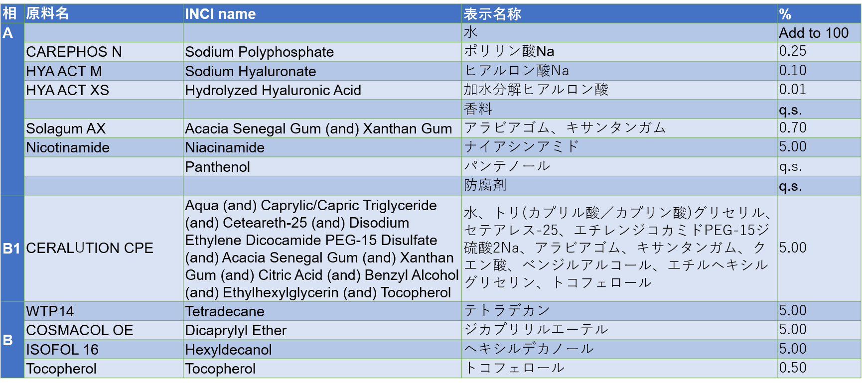 処方は自由に改変、応用、商品化することができますが、これらの処方運用に関して、直接又は間接的に生じる一切の責任、損害等について弊社はその責任を負いません。最終製品については貴社において十分な確認試験および特許調査をお勧めいたします。