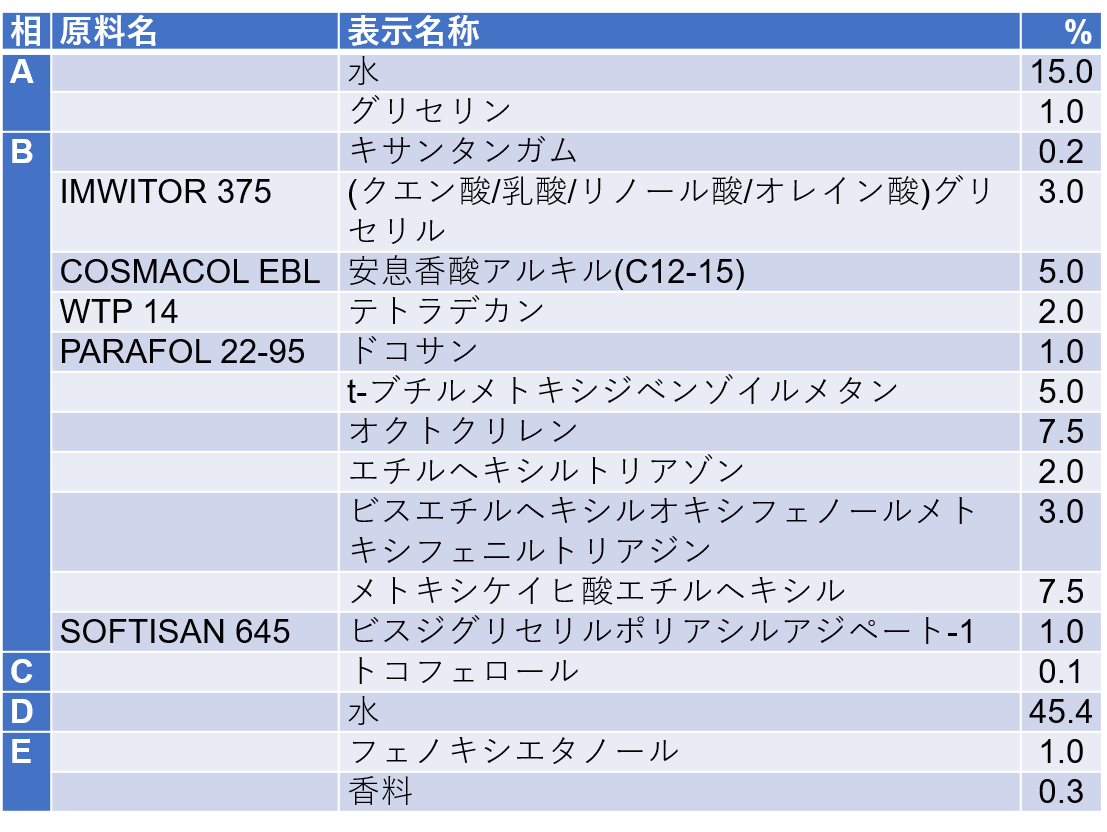 また、COSMACOL EBLはUV吸収剤をしっかりと溶解し、処方全体の安定性にも貢献しています。